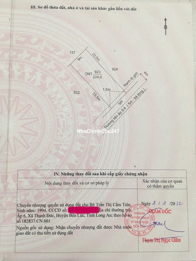 - Đất đẹp full thổ cư. Ngang 9m dài 25m (đã được vây lưới B40 chuẩn chỉnh). Thuộc dạng đất biệt thự hoặc Villa vườn. Có thể tách thành 2 lô nếu cần. - Đất vuông vức, hướng Đông Nam mát mẻ. - Mặt tiền đường bêtông 5m. Xe con quay đầu. - Đường trước nhà đang chuẩn bị mở rộng thêm (đã ủi đất 2 bên để mở rộng) - Đất gần KCN Nhựt Chánh, gần KDC Thanh Yến, dân ở đông đúc rất phù hợp cho nhiều mục đích ở, đầu tư, kinh doanh nhà trọ... - Gần chợ, trường học, cây xăng đi qua trung tâm Bến Lức rất gần. - Thương lượng khách thiện chí sớm!