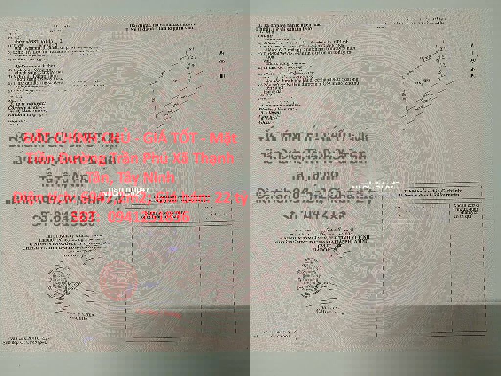 ĐẤT CHÍNH CHỦ - GIÁ TỐT - Mặt Tiền Đường Trần Phú Xã Thạnh Tân, Tây Ninh Diện tích: 6947,2m2 Giá bán: 22 tỷ(Có thương lượng**941251836) - Vị trí: Mặt Tiền Đường nhựa Trần Phú 22m. Có đầy đủ tiện ích ... - Khu vực dân cư đông đúc, an ninh đảm bảo - Giao thông thuận tiện, ô tô đến tận đất**941251836 - Pháp lý đầy đủ, SỔ HỒNG RIÊNG, thủ tục sang tên nhanh chóng Tiếp khách thiện chí - Liên hệ SĐT***