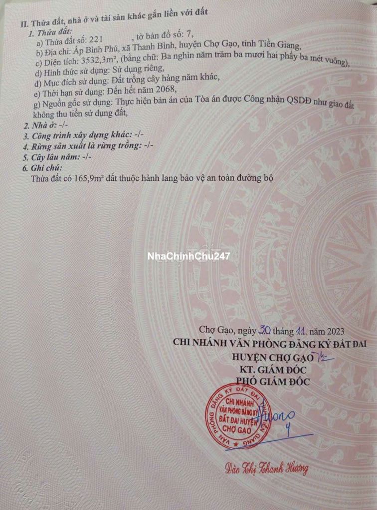 ✅Bán đất mặt tiền đường nhựa ĐH 28B. ✅Địa chỉ: ấp Bình Phú, xã Thanh Bình, huyện Chợ Gạo, TG. ✅Cách trường học, chợ, Uỷ ban xã Thanh Bình 1,5km, cách chợ Bến Tranh 4,5km, cách trung tâm TP Mỹ Tho 8km. ✅Dân cư hiện hữu, điện, nước, Wifi, đèn chiếu sáng đầy đủ. ✅Diện tích: 3532 m2, đất đã được rào lưới B40. ✅Giá: 7000000000 (thương lượng chính chủ với khách có thiện chí). ✅Điện thoại liên hệ: *** (Tâm). (ACE môi giới Hoa Hồng 2%)