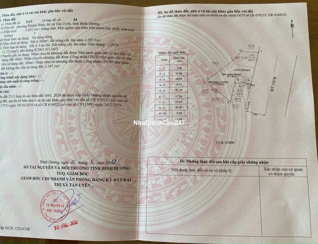 Mặt tiền DT 747 Khánh Bình - Tân Uyên - TpHCM. DT ; 3816M2 . Có 360m2 thổ cư. Mặt tiền 46m. 6 làn đường xe chạy Kinh doanh buôn bán đủ nghành nghề. Tiếp anh chị thiện chí