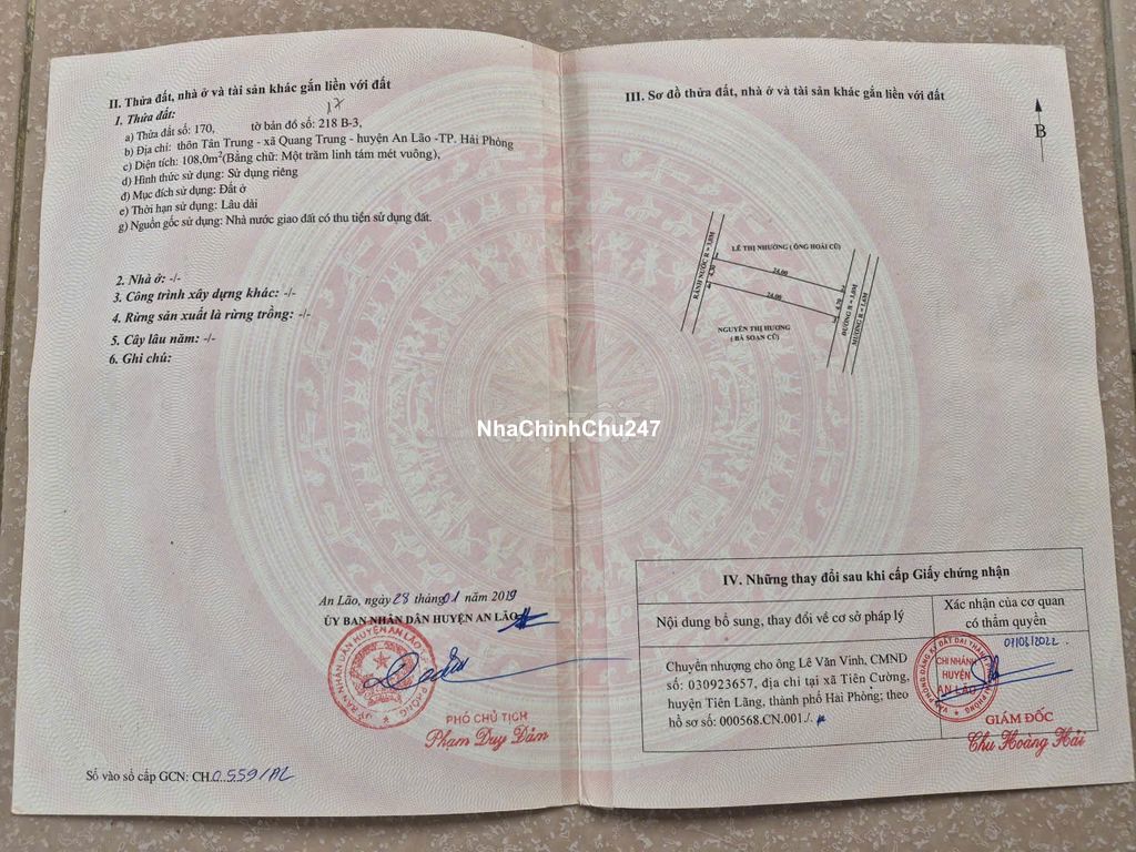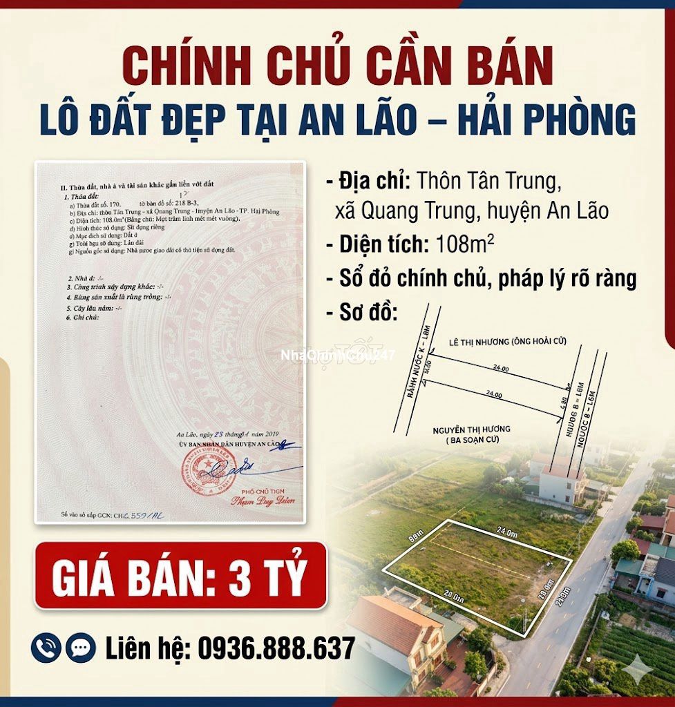 CHÍNH CHỦ CẦN BÁN LÔ ĐẤT ĐẸP TẠI AN LÃO – HẢI PHÒNG – Địa chỉ: Thôn Tân Trung, xã Quang Trung, huyện An Lão – Diện tích: 108m² – Sổ đỏ chính chủ, pháp lý rõ ràng – Đất ở lâu dài – Khu dân cư ổn định, gần đường giao thông thuận tiện đi lại – Xung quanh đầy đủ tiện ích gần trường học, chợ kênh, gần ql10… – Gần ubnd An Quang mới dưới 1km, gần cầu B49. – Thích hợp xây nhà hoặc đầu tư lâu dài Giá bán: 3 tỷ