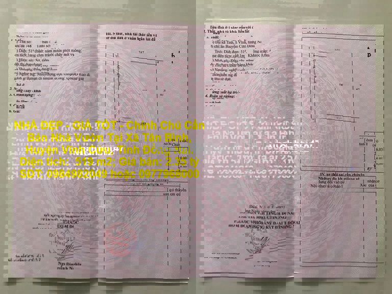 NHÀ ĐẸP - GIÁ TỐT - Chính Chủ Cần Bán Nhà Vườn Tại Xã Tân Bình, Huyện Vĩnh Cửu, Tỉnh Đồng Nai. Diện tích: 519 m2 ( ngang 20m x dài 26m ) Giá bán: 2.35 tỷ ( có thương lượng ) hh 2 % LH*984982049 - Đường 6m LH*977968000 - Kết cấu nhà cấp 4 gồm 3 phòng ngủ, 2 wc - Đất hướng Tây. Nhà làm hướng Đông Nam . - Cách đường 768B chuẩn bị làm 40m. - Quanh vườn cây dừa bao quanh đg ra trái, nhiều cây ăn trái Vú sữa, ổi, xoài chanh... - Có ao cá, vườn nuôi chim gà. - Nhà thoáng mái, chỉ việc dọn vào là ở ngay. LH*984982049 - Giáp Phường Tân Phong, Biên Hòa Và giáp khu dân cư Lavender. - Pháp lý: sổ hồng chính chủ, sang tên nhanh chóng. Mọi nhu cầu liên hệ**** hoặc**** xem nhà trực tiếp