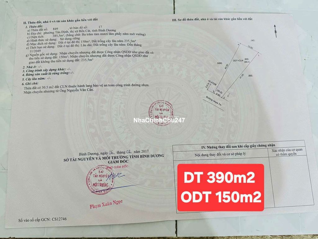 chính chủ cần bán lô đất ngang 6m x 40 nở hậu 13m . DT 385m2 có 150m2 thỏ cư. chưa qua đầu tư phù hợp xây trọ , kho. đg điện 3 pha . kinh doanh ok. dân ở kín. cam kết ko bao giờ có giá rẻ hơn. cả nhà có khách . alo em. chỉ tiếp khách thiện chí..